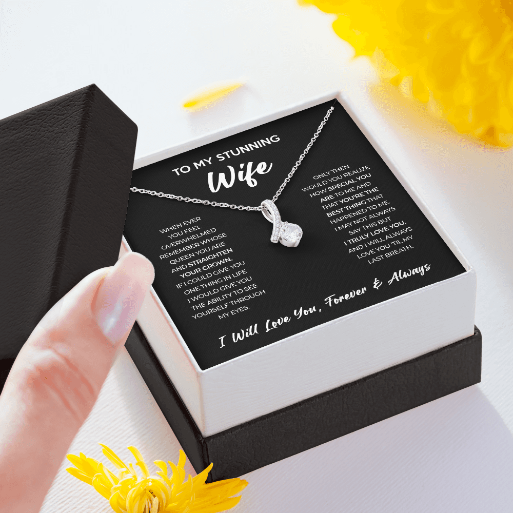Melt her heart with this ALLURING BEAUTY necklace gift! The petite ribbon shaped pendant is finished with 14K white gold over stainless steel, and is embellished with dainty clear crystals surrounded by a sparkling 7mm round cut Cubic Zirconia.